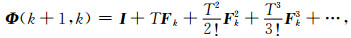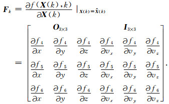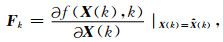 其中,Φ(k,k-1)为状态一步转移矩阵,假定协方差为Q的高斯白噪声,I为单位矩阵,T为滤波周期,Fk表示雅可比矩阵,当滤波周期较小时,Fk可近似看作常阵,其计算公式如下: