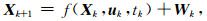 式中,Wk表示系统噪声,uk为系统输入向量,tk表示某一时刻.对式(4)进行线性化,得到如下方程: