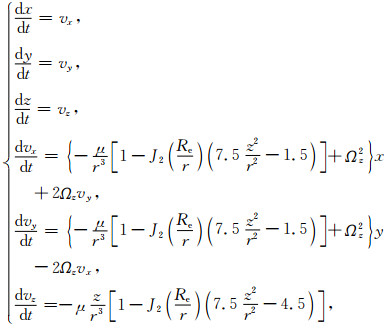 其中,x,y,z,vx,vy,vz分别表示卫星位置和速度在地心固联坐标系下的分量,地固坐标系相对地心惯性坐标系的角速度为Ω=[Ωx,Ωy,Ωz]T,Re为地球参考球赤道半径,r为空间一点的地心距,μ为引力常数.