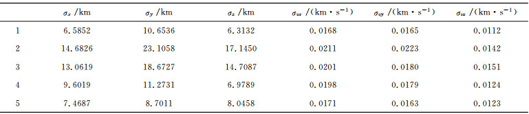 为了比较不同观测量的导航精度这里进行了多次仿真.表 1和表 2各给出了其中5次的计算结果,其中σ表示计算结果误差的均方差值.