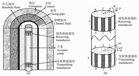 图 1 扇区水泥胶结测井模型示意图(a)和测井仪声系示意图(b) Fig. 1 Schematic diagrams of the SBT logging model (a) and acoustic sonde of SBT tool (b) |