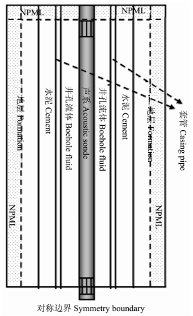 在油井工程中,固井质量评价是保证油气井稳定生产的重要环节.声波测井是应用最普遍也是最有效的固井质量检测技术.声波测井的解释方法基于套管井井孔声学理论.轴对称套管井中的声波传播理论已被广泛研究[1~6],并被有效地应用到生产实际中广泛使用的声波-变密度测井(CBL-VDL)解释.但声波-变密度测井轴对称发射-接收,只能给出井周水泥胶结情况的平均结果,不能指示周向水泥缺失分布.为克服这一不足,20世纪90年代以来又发展出新一代有周向方位识别功能的扇区水泥胶结测井装置(SBT),典型的仪器有两种:一种是6极板贴井壁测量的补偿声波水泥胶结测井,一种是柱状声系8扇区沿井8发8收的声波水泥胶结测井.他们都是采用非轴对称声系探测井周围局部水泥胶结情况,但声系结构差别很大.针对这类测井方法开展非轴对称套管井声场的理论研究,尤其是对同时有水泥局部缺失情况下瞬态全波声场的模拟计算与分析,将有助于改进水泥环周向分布的解释方法和提高解释精度,这正是油田开发所需要的.然而针对SBT探测非轴对称套管井水泥局部胶结问题开展的理论工作尚比较少.文献[7]和[8]都是针对贴井壁极板型SBT测井进行数值研究,且采用的是简化模型,考虑了声源偏心时的非轴对称性,却都没有顾及套管井的柱状多层结构和水泥局部缺失的实际复杂性.文献[9]采用2.5维有限差分算法计算了带扇形窜槽的套管井中声场,只是其声源为主频10kHz的单极点源,不能反应SBT测井主频100kHz柱状声系扇形声源激发的套管井内声场规律.而对8扇区的扇区水泥胶结测井(SBT)的理论与数值模拟问题,只有文献[10](第一作者博士论文)有所涉及.