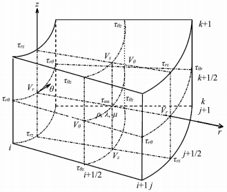 2.3 方程离散化速度和应力场,密度和拉梅系数被离散化到交错网格上,如图 3(修改自文献[16])所示.径向网格从测井仪半径处开始,这样可以避免井轴上的奇异点,简化程序.空间和时间网格步长分别为Δr,Δθ,Δz和Δt.对时间的微分采用二阶中心差分来近似,微分方程(12)可写为