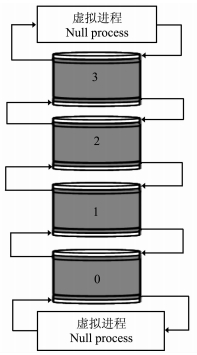 2.4 基于MPI的并行程序设计我们采用网格并行的方式,将整个计算模型分为多个子区域,每个进程计算一个子区域,这样只有子区域边界的场需要数据交换,数据通信量较小,适合在计算机集群这种分布式内存的并行计算机上运行.考虑到计算速度和编程的方便,我们沿井轴方向分割网格.图 4是以调用4个进程为例,网格划分和进程间通信的示意图.整个模型沿轴向分为4段,即4个子区域,0,1,2,3为子区域所在进程的标识.每个子区域中灰色的部分为计算区域,在计算区域边界上的数据在每一时间步都要发送到相邻的进程,白色的区域是用来接收相邻进程发送的数据的缓冲区.进程间通信用箭头表示,箭头端指向接收进程,另一端为发送进程.从二阶中心差分格式(18)式以及交错网格图 3可知,边界上的vr,vθ,τzz要被发送到上面的进程,而vz,τrz,τθz要被发送到下面的进程.进程1和2都需要和两边相邻的进程通信,而进程0只需要向上通信,进程3只需要向下通信.为了编程方便,我们引入虚拟进程[19].虚拟进程是虚无的进程,当真实的进程调用发送或接收命令时,来充当通信的目标进程或源进程.该调用会立即返回,不读写任何缓冲区.引入虚拟进程可以简化程序结构.