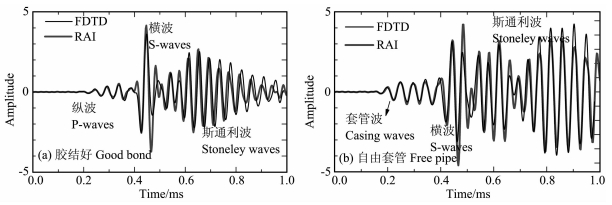 图 5 有限差分模拟波形和实轴积分法计算波形的对比 (a)胶结好,(b)自由套管. Fig. 5 Comparisons between the waveforms calculated by the FD method and the real-axis integration method (a) Good bond, and (b) free pipe. |