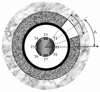 3.2 SBT测井波形的数值模拟本节我们用并行有限差分算法模拟有水泥扇区缺失的套管井中8扇区SBT测井波形.为定位方便,我们定义第一对换能器(T1)为0°,水泥环扇区缺失的位置和大小可通过其中心相对T1的方位角(θA)和其角度大小(θS)定义,如图 6所示.以下的数值模拟中,发射换能器主频100kHz,声源-接收器间距0.6096m(2ft),记录的波形为接收换能器中心处的声压.测井仪、井孔流体、套管和水泥环的外半径分别为25mm,62mm,70mm和100mm,换能器高度40mm,声学参数见表 1.有限差分网格步长为Δr=1.0mm,Δz=2.0mm,Δθ=0.975°(0.0167rad),Δt=5.13×10-5 ms,NPML层厚度为12个网格.