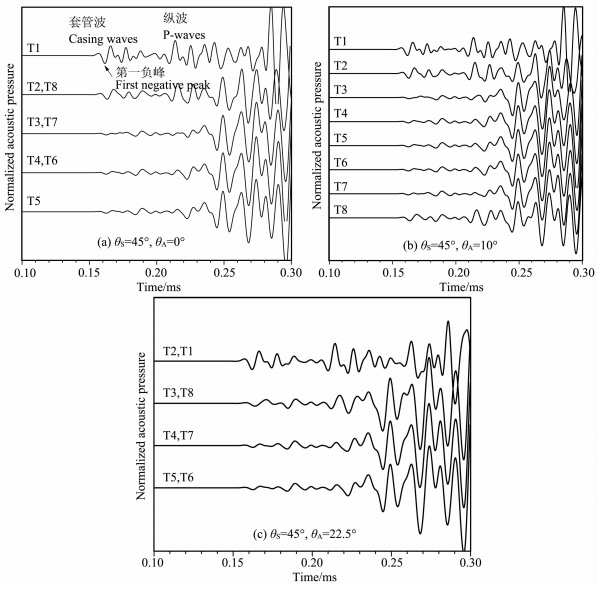 图 7中给出了扇区缺失大小为θS=45°时SBT测井模拟波形,方位角分别为(a)θA=0°,(b)θA=10°,(c)θA=22.5°.波形上所标T1-T8为产生该波形的换能器对序号(图 6).波形均按图 7a中T1测得波形最大值归一化.当两对换能器中心和缺失中心夹角相同时,它们测得的波形相同,被放在一起显示,如图 7a中的T2和T8.可以看到套管波以及地层纵波的幅度随着夹角的增大而减小.