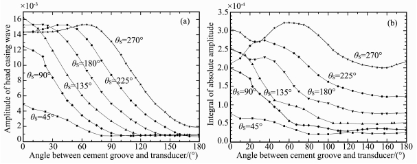 图 7中波形的分析结果在图 8中给出,为带有实心方块的线.图 8a为套管波头波的幅度(第一负峰幅值,以下简称幅度),图 8b为套管波前5个周期的积分值(以下简称幅度积分).当θS=90°,135°,180°,225°,270°时(方位角有所不同,见表 2),模拟波形的分析结果也在图 8中给出,由于篇幅限制,波形本身没有给出.