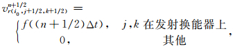 为消除有限大模型外边界的人为反射波,NPML被用来包围计算区域.我们令发射换能器中心所在平面为对称边界,这样下边界就不需要NPML层,从而提高计算效率.如图 2所示,NPML只出现在径向最外层以及接收换能器以上的区域.
