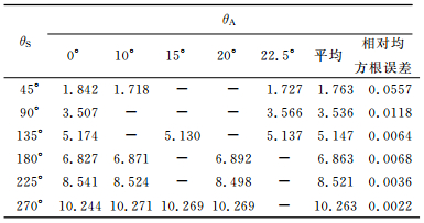 注意到相邻两对换能器间的夹角为45°,对于一定的θA,可以求出每对换能器和缺失扇区中心的夹角,例如当θA=10°,换能器T1-T8与缺失扇区间的夹角分别为10°,35°,80°,125°,170°,145°,100°,55°.因此对于某一大小为θS的缺失,我们可以分析套管波幅度随夹角的变化规律.
