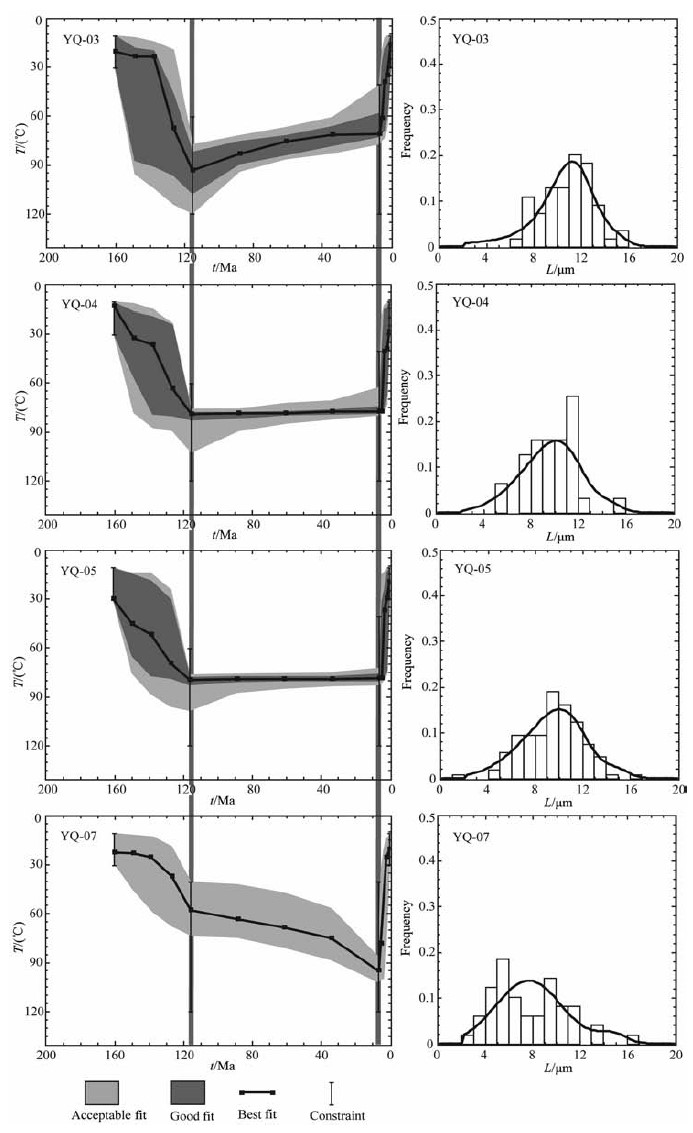 从图 4模拟结果来看,样品YQ-03,YQ-04,YQ-05得到了较好的模拟T-t曲线结果,YQ-07模拟T-t曲线达到了可以接受的程度.模拟结果表明:从160 Ma左右起侏罗系盆地持续线性增温,说明沉积作用持续进行;在早白垩世晚期115 Ma左右达到最大温度90℃左右,盆地沉积物达到最大埋深3000多米,这一过程沉积速率达到66.7m/Ma;115 Ma之后盆地温度长时期基本稳定,这表明沉积和剥蚀基本达到平衡;自中新世晚期6 Ma左右以来盆地温度以11.7 ℃/Ma的速度突然下降,侏罗系后城组地层快速冷却,直至上升到地表遭受剥蚀,剥露速率超过了500m/Ma.