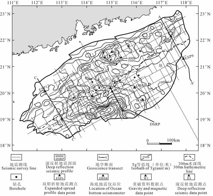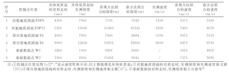 (2) 根据研究区内深反射地震、双船折射地震、海底地震仪地震测线、重磁等资料,在各个构造单元选择控制点读取深部地层的时间-深度数据;
