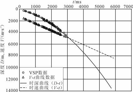 时深转换[1~4]是地震-地质解释的必经环节,其准确度和精度直接影响到地震解释结果的优劣.基底是盆地基础地质研究的重要内容[5~7].但基底埋深大、钻遇井少,为钻井所揭示的基底层段通常很薄、远未达到基底研究所涉及到的深度.这些都给基底研究造成难以克服的困难[8~12],集中表现为基底研究所涉及深度的地震时深转换问题.即目前常规的时深转换都是VSP (Vertical Seismic Profiling)方法[13~16],钻井的时深数据是时深转换的必要条件,它是基于钻井获取的垂直反射地震双程反射时间与对应井深资料实现时深拟合.而对于钻井尚未达到的基底而言,时深转尺制作一般采用曲线下延方法加以解决1).