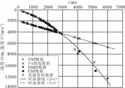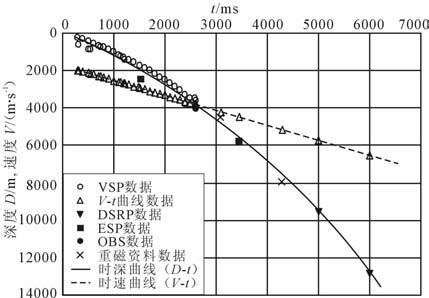 图 3 浅水区校正拟合的时深关系(D-t)和 时速关系(V-t)曲线 VSP为垂直地震剖面;DSRP为深反射地震剖面;ESP为 双船折射地震剖面;重磁数据据王万银重磁解释资料2) Fig. 3 Corrected curves fitted to the time-depth and time-velocity data in shallow-water area |