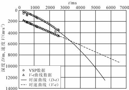 (3) 将选取的控制点时深数据与选取的井VSP数据拟合二次多项式的时深关系式,进而得到时速曲线;