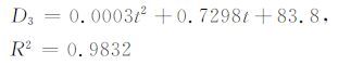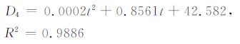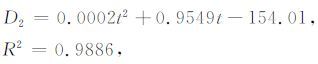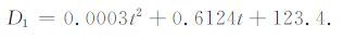 其中D2 代表用二次多项式拟合的的深度(从海底算起),单位为m;t代表双程反射时间(从海底算起),单位为ms.然后利用公式(4)进行时深转换后加上水深即为最终结果.其时速关系式为线性方程: