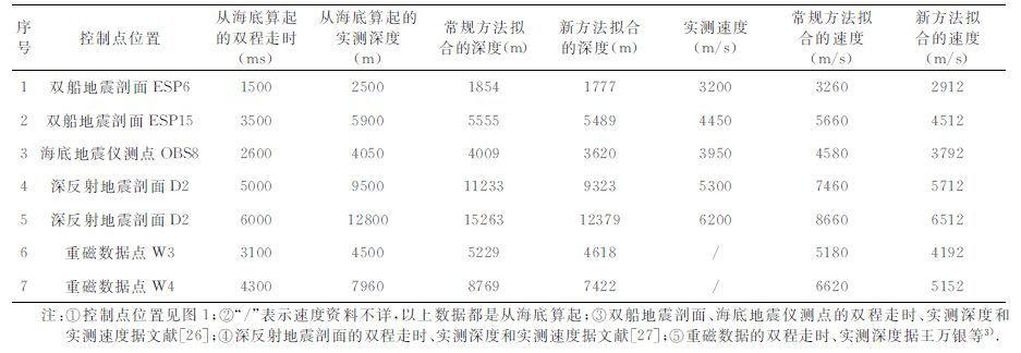 应用本文提出的方法,根据研究区内双船折射地震、海底地震仪测点、深反射地震和重磁数据等资料选取7个控制点(见表 3),读取深部地层的时间-深度数据(表 3第3、4列),与5口井的VSP数据拟合了新的二次多项式形式的时深公式(曲线见图 5):