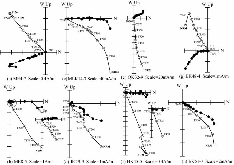 图 3 代表样品倾斜校正前的系统热退磁结果的正交矢量图;实心圆和空心圆分别代表剩磁方向在水平面和铅垂面上的投影 Fig. 3 Orthogonal vector plots of progressive thermal demagnetization for representative specimens in-situ.Solid and open circles indicate vector endpoints projected onto the horizontal and vertical planes, respectively |