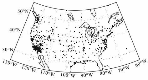 图 1 北美地区GPS观测台阵的分布图 Fig. 1 Distribution of GPS stations over North America |