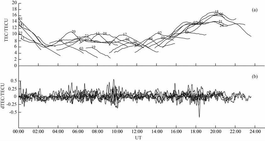式中Is 为斜向TEC,L1 和L2 是卫星信号的载波相位(已经转换成了长度单位),λ1 和λ2 是卫星信号的波长,n1 和n2 是整周模糊度,br 和bs 分别是接收机和卫星的误差项.本文通过多项式拟合得到背景TEC 的变化趋势I,然后由Is-I得到TEC 的扰动部分dTEC.图 2为台站p262(38.0°N,122.1°W)观测到的斜向TEC 进行滤波之后的dTEC 扰动时序.图 2a 中的实线表示对应31 颗卫星的原始垂直TEC,图 2b中的实线是斜向TEC 分段拟合求残差并滤波后的dTEC 扰动时序.从图 2a中可以看出,在TEC 的值比较小的夜晚,在TEC 时序中叠加有中尺度的电离层扰动.图 2b显示,扰动主要发生在05∶00~10∶00UT 时段,对应于21∶00~02∶00LT的夜间.