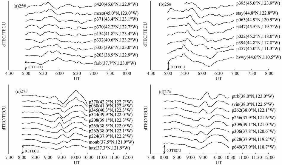 3 结果分析 3.1 夜间电离层行进式扰动的经纬度分布和地方时变化图 3(a~d)为2008年2月23日(地磁活动平静日0<Kp<2+)夜间观测到的不同经纬度的四组TEC 扰动曲线.其中,图 3(a, c)分别是沿123°经线的不同纬度的台站分别通过25 号和27 号GPS 卫星观测到的TEC 扰动曲线.图 3(b, d)分别是25号和27号GPS卫星分别沿45°N 和38°N 的不同经度的台站观测到的TEC 扰动曲线.图中标出了各曲线所对应的GPS台站及其所在的地理经纬度.