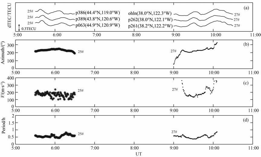 两次扰动相应的最大熵频谱分析结果在图 4中给出.其中图 4a为25 号和27 号GPS 卫星探测斜向TEC 进行滤波后的dTEC 扰动时序.六组曲线分别是六个不同台站探测的结果.图中给出了台站名称、地理经纬度以及卫星号.这六个台站组成了两组GPS观测台阵,每组台阵之间的距离都小于40km, 以避免互谱分析时由于台站间距过长引起数据时序相位整周模糊度问题.图 4(b~d)分别为两组GPS观测台阵经谱分析得到的扰动传播方位角(由正北方向起,顺时针到扰动的传播矢量之间的夹角)、相速度及周期(两组台阵的结果分别用星号线和点线表示).从图 4(b~d)的最大熵计算结果可知,午夜前扰动的周期为30~40 min, 传播方位角为210°~250°,平均相速度为139m/s(星号线);午夜后扰动的周期为20~40min, 传播方位角为220°~300°,平均相速度为156m/s(点号线).与午夜前相比,午夜后的扰动周期和传播方位角的变化范围以及平均相速度都要大于午夜前的情形.