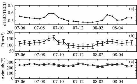 Tsugawa等(2007)[11]和Kotake 等(2007)[12]分别对北美地区和加州南部夏季(5~8 月)夜间中尺度电离层行扰的研究表明,扰动的最大振幅大于0.5TECU,以60~150m/s的水平相速度向西南方向传播,周期约为15~60min.而由图 4(a~d)的最大熵计算结果可以看出,本文所观测到的夜间中尺度扰动的最大扰动振幅为0.64TECU,以100~250m/s的水平相速度向西南方向传播,周期约为20~40min.本文所得到的水平相速度要比以前学者所得到的水平相速度的变化范围大,而周期的变化范围相对比较小,这可能是由于数据处理方法的不同导致的,也可能是由于观测夜间扰动的季节不同所致.