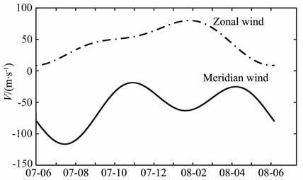 由图 5(b~c)可以看出大部分夜间中尺度电离层行扰的水平相速度为100~200m/s, 传播方向基本为西南方向(200°~300°),但是夏季(2007年6~8月,2008 年4~5 月)的水平相速度明显比冬季(2007年11月~2008年2月)的要大,传播速度的季节变化与午夜前后热层风的季节变化有关.热层风是电离层F 层的主要风系,其纬向分量一般从午后(~16∶00LT)至黎明前(~04∶00LT)为东向,而在其余时段则表现为西向风场;其经向分量在白天是向极区,夜间是向赤道的[15].图 6为利用HWM07模式计算得到的2007年6月~2008年5月期间,午夜时刻(08∶00UT)热层风的纬向分量(向东为正)和经向分量(向北为正)的变化情况,图中的点划线表示纬向分量,实线表示经向分量.由图可以看出,午夜时刻热层风的经向分量都是赤道向的,纬向分量都是向东的,但是夏季(2007 年6~8 月,2008年4~5月)的热层风的赤道向分量要比冬季(2007年11月~2008年2月)的大,而东向分量要比冬季的小.而夜间中尺度电离层行进式扰动的传播方向是西南方向,故热层风的赤道向分量会增大扰动的视在水平传播速度,而热层风的东向分量会减弱扰动的视在水平传播速度,所以两者叠加的结果就是夏季夜间中尺度电离层行扰的水平相速度要大于冬季.