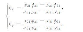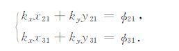 由最大熵方法得到的频率ωobserve和相位差Φ21和Φ31可以确定夜间中尺度电离层行扰的其他传播参量.假设观测点附近的地球表面是一个平面,选取观测阵中的任意1个台站所在位置为坐标原点建立直角坐标系,则3个台站的位置坐标分别是(0,0),(x21,y21)以及(x31,y31).孤立平面行波因子表示为exp[j(ωt-kxx′-kyy′+φ0)],设待求的扰动水平波数是kx和ky,则