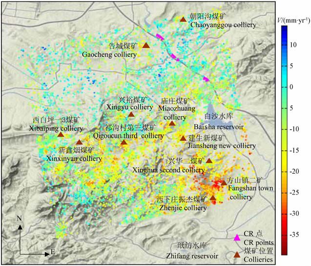 图 10 研究区域煤矿位置分布图(以PS点沉降速率图为底图) Fig. 10 Distribution of collieries over the study area (with the deformation velocities image on PS points as background) |