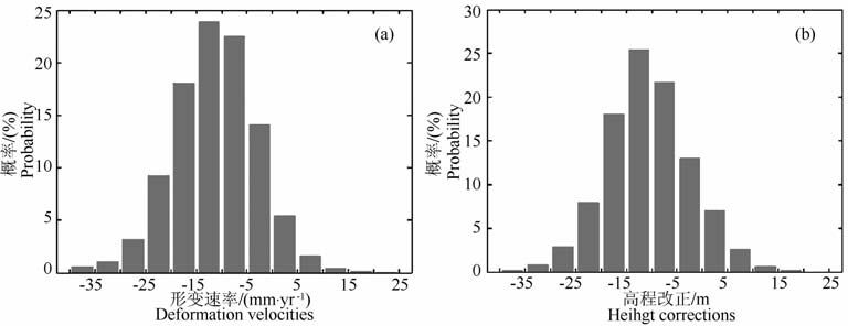 图 11为根据本文算法得出的高程改正场.由图 11可知,研究区域内高程改正值基本分布在±10m内,与外部SRTM 高程精度为10m 吻合.但由于外部DEM 数据时效性不强,且去地形处理过程中容易引入配准、噪声等引起的误差,导致部分区域如白沙水库西南角、高速公路西南段的高程改正值达20m左右.根据本文算法将PS 点沉降速率量值概率分布统计如图 12中,由图 12a可知,研究区域内PS点的沉降速率值大部分集中在-20~5 mm/a,所有PS点上的沉降速率均值为10.192mm/yr,矿区分布区域的PS点由于矿产资源的开采活动导致沉降速率值较大,最大沉降速率值达-8cm/a,图 12b为高程改正值的统计结果,高程改正值总体分布在-15~10 m,所有PS 点上的高程改正值均值为3.6m,最大高程改正值为-22m.