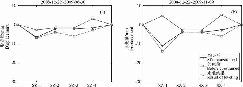 为进一步证明联合算法获取的PS点沉降速率结果的准确程度,我们仍然利用4.1 节中采用的四个水准验证点作为PS 网沉降速率的外部验证数据,对本文算法和传统算法结果分别进行精度估计.具体操作时,采用100m 内平均值法进行验证[3],将水准点位置附近100m 范围内的所有PS点沉降值转换为垂直向形变结果并取平均,以与水准验证点位置沉降值进行比较.由于应用外部水准测量方法对水准点进行施测的时间分别为2008 年12 月22日,2009年6月30日和2009年11月9日,其中在2008年12 月22 日和2009 年11 月9 日分别为SAR 影像获取时间(见表 1),而2009 年6 月30 日时对应的形变量可通过插值方法计算得出.因此最终用于与水准点进行比较的PS点沉降量均值的时间段分别为2008 年12 月22 日至2009 年6 月30日,2008年12月22日至2009 年11 月9 日.图 13为两种算法获取PS点沉降量与这四个水准验证点上的沉降量对比结果.在2008 年12 月22 日到2009年6月30日期间,本文算法结果中PS点沉降量均值与水准验证点位置沉降量间误差均分布在3mm范围内,而传统算法结果中SZ-4 号水准验证点位置出现抬升;而在2008 年12 月22 日到2009年11月9日期间,传统算法结果中SZ-1与SZ-4号水准验证点位置均发生了较大量的抬升.将其具体的均方误差统计结果表示在表 3 中.从表中明显看出,加入了CR 点数据约束后,研究区域内的PS 点上的沉降结果估计精度明显提高,同时纠正了一些不合理的抬升点,特别是在2008 年12 月22 日至2009年11 月9 日时间段内,由于传统算法中参考点选取的不确定性,参考点位置处存在的沉降将误差引入了研究区域内PS点沉降结果中,误差较大.而加入CR 点约束后,PS点测量结果与各水准点的差异均方误差在两时间段内均值为±2.0mm,低于CR 点上获取的形变速率的精度±1.2 mm(表 2),证明了应用CR 点速率作为约束数据的合理性.从验证的结果上明显体现出了加入CR 点约束后的优势.