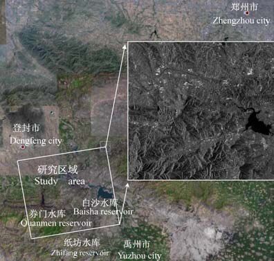 3 实验数据与处理方法 3.1 实验数据为验证上述算法流程,选取河南省境内约250km2范围为研究区域,所覆盖的中心大地坐标约为(113°8′E,34°21′N).研究区域位于郑州市西南方向,登封市与禹州市交界地带,由于距离城区较远,区域内居民区多以村落为主(如图 3所示).由图可见,区域覆盖了白沙水库、券门水库两大水库,区域南部地形以山体为主,且山体上植被覆盖稀少,多为裸露山体,而平坦地区多为河流及植被覆盖区.研究区域矿产资源丰富,矿山较多.沿研究区域内高速公路安装了三组共12个人工角反射器.实验中数据选取2007 年2月到2009年12月期间14 景PALSAR 影像.影像采样间隔为距离向3.17m,方位向2.34m.影像详细参数信息见表 1.