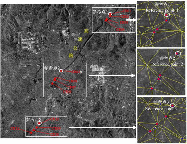 图 5 研究区域内CR点位置分布及三组CR点在PS基线网络中的网络连接图 Fig. 5 The distribution of CR points over the study area and the network connections of three teams of CR points in PS network |