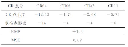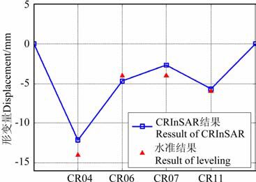 4 实验结果分析与验证 4.1 实验结果分析图 7为通过CRInSAR 算法获取的CR 点上年形变量(形变速率)结果,由图可见,实际计算得出的CR 点基本保持稳定,但由于高速公路附近矿区的持续开采,导致角反射点所在位置均发生沉降,其中CR04号点的年形变量达到了厘米级.实验过程中水准测量路线同样分为三段,各段路线的起始点均选取为三组角反射器的参考点位置(CR01,CR05和CR12),各段路线中,有四个水准测点位置与CR04,CR06,CR07和CR11四个点位非常接近,因此本文将这四个水准测点选取为实验结果的验证点.水准实际施测时间分别为2008年12月22日,2009年6月30日和2009年11月9日,其中在2008年12月22日和2009年11月9日分别为SAR 影像获取时间(见表 1),因此我们将这一时间段内的四个水准测点的形变结果作为CR 点上的外部验证数据,水准结果同样表示于图 7 中.从图中可以看出CR 点上计算所得的形变结果与水准测量的结果吻合较好.为进一步验证CR 点形变结果的精度,应用平差理论中的精度评定方法对12 个CR 点一年内的形变量进行了内部精度评定.由表 2可知,CR 点在一年内形变量的中误差均值(表中用MSE:MeanSquareError表示)为0.02mm,而与水准数据接近的四个CR 点的外部均方根误差(表中用RMS:RootMeanSquare表示)仅为±1.2 mm,可以将其作为后期PS网络的约束数据.