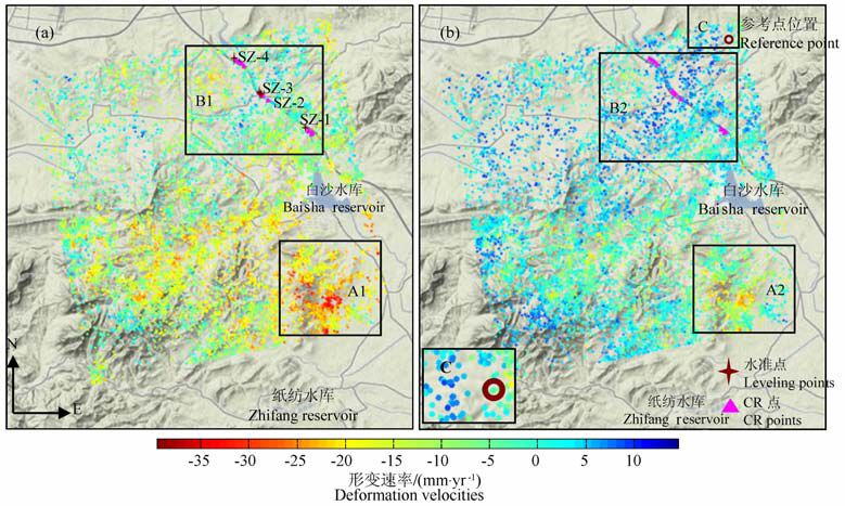 为合理显示研究区域内煤矿的沉降情况,我们对研究区域内的煤矿位置和实际沉降情况进行了资料搜集,图 10为研究区域内一些主要煤矿的位置分布图,其底图为本文算法获取的PS点沉降速率结果.由图 9和图 10可见,在一年时间间隔内,部分沉降区可在图中明显看出沉降趋势.其位置分布总体上与差分干涉图中条纹明显位置吻合(A1区处沉降漏斗对应于图 4中A区).研究区域内沉降量总体上分布在-20~5mm/yr,存在缓慢沉降,对照煤矿在地图上位置可知,沉降较为明显的区域均为矿区分布密集区域.其中,最为明显的A 区为方山镇二矿所在位置.根据本文实验结果,其年累积沉降量在斜距方向约4cm,如果认为其均为垂直向沉降量的贡献,其垂直向的年累积沉降量为约5cm;在研究区域中部位置,由于祁沟村第三煤矿、庙庄煤矿及建生新煤矿的持续矿产资源开采,导致中部地区的PS点速率颜色分布以黄色和红色为主,其年累积沉降量约为3cm;与中部和东南部的明显沉降量相比,北部区域的沉降缓慢,基本分布在毫米级(颜色以绿色和蓝色为主),但在人工角反射器分布的高速公路两侧依然存在两个沉降漏斗,其位置刚好为告城煤矿和朝阳沟煤矿的分布位置,由于持续的矿产开采,沉降漏斗已经开始发育.