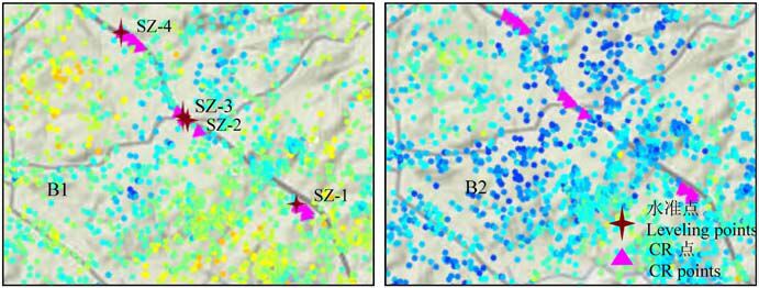 将CR 点上获取的参数值作为约束数据,依据2.3节中介绍的联合解算算法对整个研究区域内进行PS基线网络的空间维解缠.为进一步突出本文提出的联合解算算法的优势,我们同时对研究区域内进行了传统PSInSAR 算法实验,即在空间维解缠中不考虑CR 点信息,选取一个假设稳定点作为参考点得以实现.具体操作中,结合对研究区域进行的DInSAR 实验结果中稳定区域分布情况作为先验信息,选取右上角处C 点为参考点(图 8),作为整个PS基线网络中空间维解缠的起算数据点.空间维解缠过程中同样采用间接平差方法以避免出现基线网络闭合环中参数增量和为零的情况(详见引言).将两种方法所获取的研究区域内PS点沉降速率结果表示在图 8(地图坐标系,以外部地形图为底图)中,从图中可以看出,两种算法的结果中,沉降明显区域分布位置总体类似,尤其是在A1 区内均有一明显沉降漏斗发育.但由于参考点选取的不确定性及参考点本身不稳定,导致两种算法的结果仍存在较大差异:(1)从整体效果来看,本文获取的沉降速率场总体表现为沉降,尤其是在南部约一半面积区域内颜色以红色和黄色为主,而传统方法获取的沉降速率场总体为抬升;(2)东南角处的沉降漏斗非常明显,沉降速率值达4cm/yr,而传统方法获取的结果中,东南角位置有一沉降漏斗发育,但沉降速率仅约为2cm/yr;(3)人工角反射器分布的高速公路附近区域沉降区势差异也较大(放大效果图显示于图 9中).根据本文结果,高速率公路上的点基本保持稳定,仅仅CR04号点所在位置存在约1cm 的年累积沉降,但在公路两侧由于有矿区分布导致2cm左右的年累积沉降(两侧黄色点分布位置),由于处理过程中我们没有针对大气相位进行去除,只是在PS基线网络布设时限制了基线边距离,尽量减弱其影响,但由于大气延迟残留相位依然可将误差引入到最终形变速率结果中,因此在图 9a中高速公路西南方向,研究区域的西北角处可看到个别PS 点存在轻微抬升.而传统方法获取的结果,在高速公路上发生成片区域的明显抬升,仅仅在西北角位置处有轻微沉降.