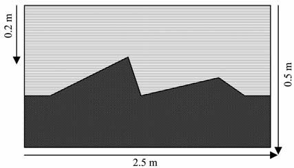 5 偏移实例 5.1 不同倾角的锲形地电模型首先验证算法在均匀介质中解决倾角限制的有效性,选择一个锲形模型,如图 4 所示.该模型为2.5m×0.5m 矩形空间,上层为粘土层,下层为湿砂层,介质的电导率σ1 =1.4×104 S/m,σ2 =0.0069S/m,介质的相对介电常数ε1=2.6,ε2=25,取天线中心频率为900 MHz,模型中设置了30°、75°、15°三种倾角的反射界面.