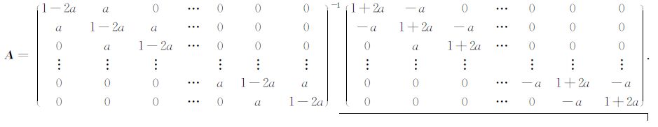 其中,a=VΔt′Δz′/(8Δx′2),I是以(0,1,0)为主对角元素的三对角矩阵,T是以(-1,2,-1)为主对角元素的三对角矩阵,可加进x′ 写成单元格形式: