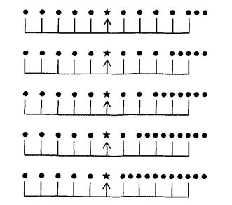变网格交界处的过渡区各点需要重新推导差分格式以减小人为干扰.对于空间十阶精度的差分格式,需要修正差分格式的点有5个.过渡区的处理方法由图 2所示.星形符号标示的点为计算导数的点,图中同时标注了参与该点导数计算的点.修正的过渡区差分格式保持两边计算点距中心点对称的特征,以期减少人为干扰.
