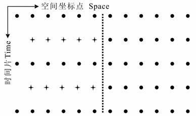 改变时间步长需要在大时间步长区设置一个过渡带,利用大时间步长求出过渡带区域中下一时刻的波场值,采用内插方法得到小时间步长计算所需的各时刻波场值.图 3为变时间步长的示意图.图中使用十字星标注的点为需要插值的点.由于时间差分算子精度小于空间差分算子精度,时间维度上的精度敏感性较空间低[10],因此内插引入的误差不会造成明显的人为反射.