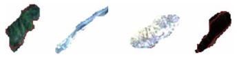 在实验中用到其中TM1、TM2、TM3、TM4、TM5、TM7共6个波段,空间分辨率均为30 m.图像质量良好,无云影,较清楚地反映了该地区土地覆盖情况.通过对实际情况的目视判读,本处将影像中的地物分为裸露地区、植被、河流和阴影四类[17].实验中以一个像素点为一个样本,使用ENVI4.6在影像上截取样本集数据,共获取681样本,其中供网络学习的训练样本481个,同时为了检查网络的泛化能力,每个类别准备了50个测试样本,共200个测试样本.图 4为样本集图像,表 1为部分样本集数据,数据包含了样本点的经纬度和6个波段的像素值.