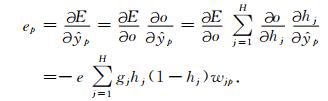 在上层的神经网络中,采用三层前向网络,输入层神经元个数为(P+Q)个(P表示模糊子系统的个数,Q表示输入中连续变量的个数),中间隐层神经元个数为H,输出层只有一个神经元.输入层到隐层的权重矩阵分为两部分,其中连接模糊子系统输出与隐层神经元的权重用矩阵Wp=(Wjp)H×P表示,连接连续输入变量与隐层神经元的权重用矩阵WQ=(Wjp)H×P表示,隐层神经元偏置值向量记为b=(bj)1×H,隐层到输出层权重记为向量g=(gj)1×H,其偏置值记为d,网络输出记为o.隐层神经元的传递函数采用Sigmoid函数f1(x)=1/(1+e-x),输出层神经元采用线性传递函f2(x)=x,则输出可写为[13~16]