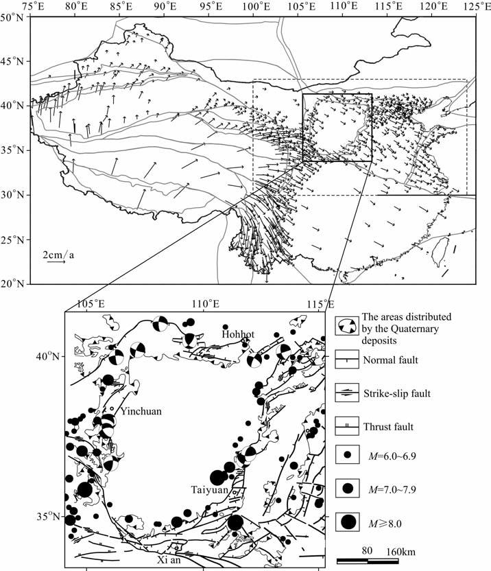 图 1 (a)中国大陆活动块体分布[1]及相对于欧亚板块稳定点的GPS速度场[2],虚线矩形框表示数值模拟范围,实线矩形框表示鄂尔多斯地块及其邻近地区;(b)鄂尔多斯地块及其邻近地区的活动构造及地震分布情况 Fig. 1 (a) Active blocks[1] and GPS velocity tield of continental China[2] ,the dash rectangle is the whole area ofmodeling, and the solid rectangle is Ordos block and its adjacent area; (b) The earthquake distribution aroundOrdos blockand its adjacent active areas |