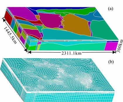 依据地面的地质和地球物理资料只能推测地表附近的构造活动状况和岩石圈现今结构分布,难以对三维空间的运动过程进行确切的讨论.已有很多文献报道了数值模拟技术在岩石圈动力学、运动学、地震模拟等各方面的应用[16~21].早期的研究主要基于弹性体模型,随着流变学研究的发展,黏弹性体模型被越来越多地用于模拟构造的演化及其运动过程.然而,迄今为止的绝大多数研究都是基于概念模型,在模型几何结构、物理属性以及边界约束条件等方面都作了很大的简化,与实际情况相差较大.近几年对鄂尔多斯地块及其周边地区进行了大量的地球物理观测,得到了它们的深部结构和物质性质[22~28].在综合整理这些资料的基础上,本文利用三维数值模拟技术来研究鄂尔多斯地块的运动和形变状态,揭示其不同圈层间的相互作用和运动特征.