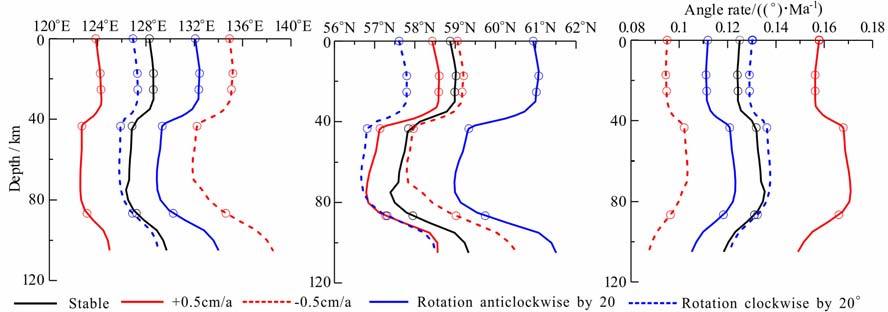 为了研究鄂尔多斯地块的水平运动随深度的变化,利用数值模拟结果,我们计算了鄂尔多斯地块不同深度的欧拉极参数.图 4 显示鄂尔多斯地块的欧拉运动在下地壳附近出现了快速的变化,而在中、上地壳和岩石圈地幔内部,欧拉极参数保持较好的稳定性.壳幔间较大的速度梯度带则表明它们之间存在较大的水平运动差异.为了进一步验证这一结果的稳定性,我们在稳态计算的基础上,在模型的西部速度边界进行了4种改变:在速度方向保持不变的情况下,速度幅度分别增大0.5cm/a和减小0.5cm/a;在速度大小保持不变的情况下,速度方向分别逆时针旋转20°和顺时针旋转20°.从图 4可以看出,在这些不同的边界条件下,鄂尔多斯岩石圈内部纵向水平运动差异均完好存在,表现出非常好的稳定性和系统性.因此,可以认为在选定的边界条件范围内,数值模拟获得的鄂尔多斯地块壳幔间的纵向水平运动差异主要由内部的物质性质所决定,并描述了其层间相互作用的主要特征.
