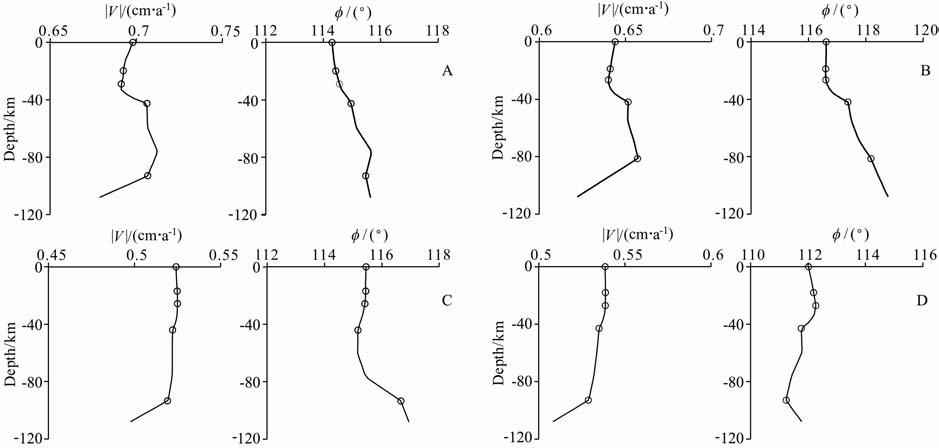 图 5 鄂尔多斯地块内A、B、C、D 四点稳态时速度幅度(|V|)和方位(Φ)随深度的变化 图中曲线上圆圈自浅至深表示地表、上地壳底界、中地壳底界、下地壳底界(莫霍面)和岩石圈底界. Fig. 5 Variation of velocity amplitude( |V|) and azimuth (Φ)for A,B,C and D sites inside Ordos block modeling in stable status Circles in these curves are earth surface and the bottom of upper crust ,middle crust ,lower crust (Moho) and the bottom of lithosphere from shallow to deep of the earth. |