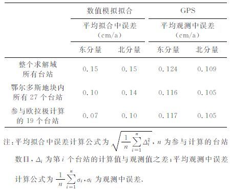 由图 3和表 1可知,数值模拟结果与GPS结果具有良好的一致性.鄂尔多斯地块内部所有GPS观测点处的平均拟合中误差与GPS 平均中误差基本一致,表明数值模拟总体拟合程度已落入观测误差以内.对于地块内部参与计算欧拉极的19 个台站,无论是东分量还是北分量,其总体拟合程度均已落入观测误差以内,这表明数值模拟结果很好地模拟了鄂尔多斯地块的刚性运动,同时也表明是局部形变或其他偶然因素导致北分量拟合稍差.数值模拟与观测结果之间的拟合差小于观测中误差,表明模拟结果已满足地球物理反演拟合的要求,这在三维动力学数值模拟中是很难达到的.此外,自动删除拟合残差较大的台站后,拟合差得到了显著的减少,说明在求解欧拉极过程中我们所采取的措施产生了显著的效果.