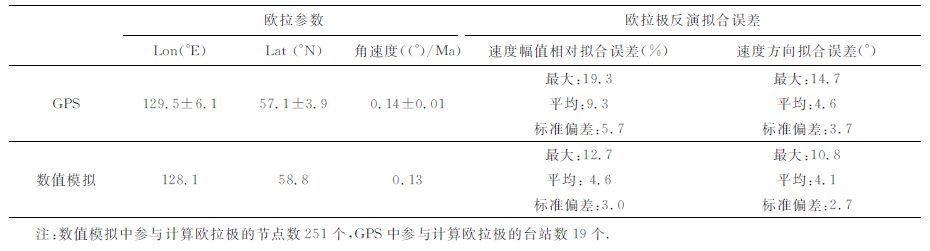 表 2 数值模拟结果计算的鄂尔多斯地块欧拉极与GPS速度场结果计算的对比 Table 2 Comparison of Euler poles calculated by modeling results and observed GPS data |