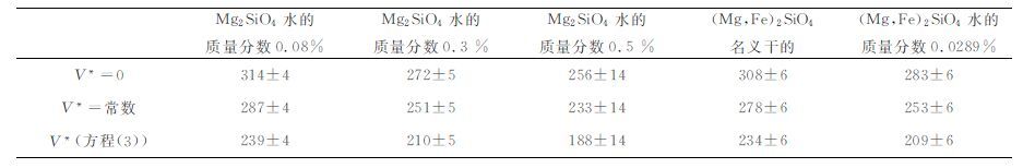 当活化体积V* 采用方程(3)的形式,常数或者V* =0,指前系数拟合值如表 2所示.水的质量分数为0.08%的镁橄榄石数据的指前系数拟合值接近于水的质量分数为0.3%的镁橄榄石数据的拟合值,而且随水含量的增加反而略有减小.这明显不同于方程(5)所预测的结果.